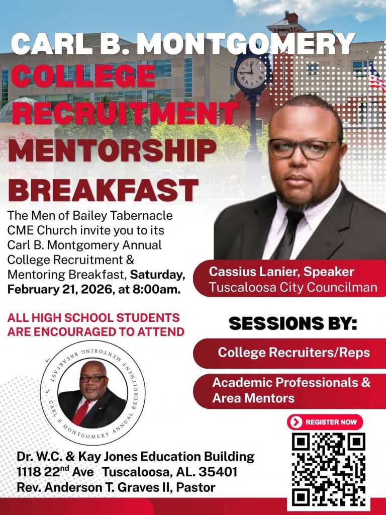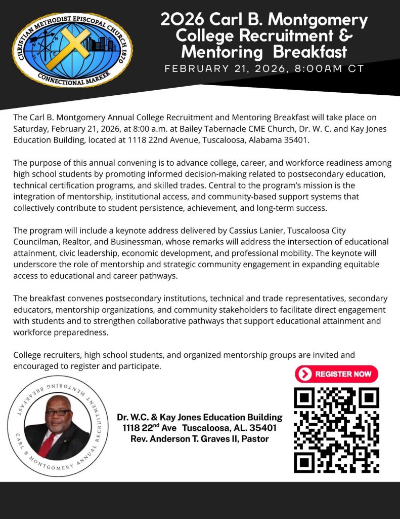 Register TODAY for The Carl B. Montgomery Annual College Recruitment & Mentoring Breakfast to be held on Saturday, February 21, 2026, 8:00 a.m. * Bailey Tabernacle CME Church, Dr. W. C. & Kay Jones Education Building * 1118 22nd Avenue, Tuscaloosa, AL 35401.